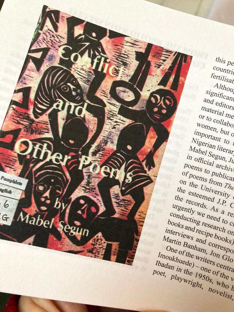 There is surprisingly little written on Segun, or on the work of pioneering female editors like Frances Ademola (née Quarshie-Idun), editor of Reflections: Nigerian Prose and Verse, in which four of Segun’s poems and an article were published alongside the work of Achebe, Clark, Gabriel Okara, Christopher Okigbo and Soyinka. Although my research has shown how important small magazines were for young writers who wanted to share their writing and ideas, Segun has also talked about the challenges she faced as a young female intellectual in Ibadan in the 1950s, including the way that the student newspaper, The Bug, circulated sexist and stereotypical ideas about her and other prominent female students.