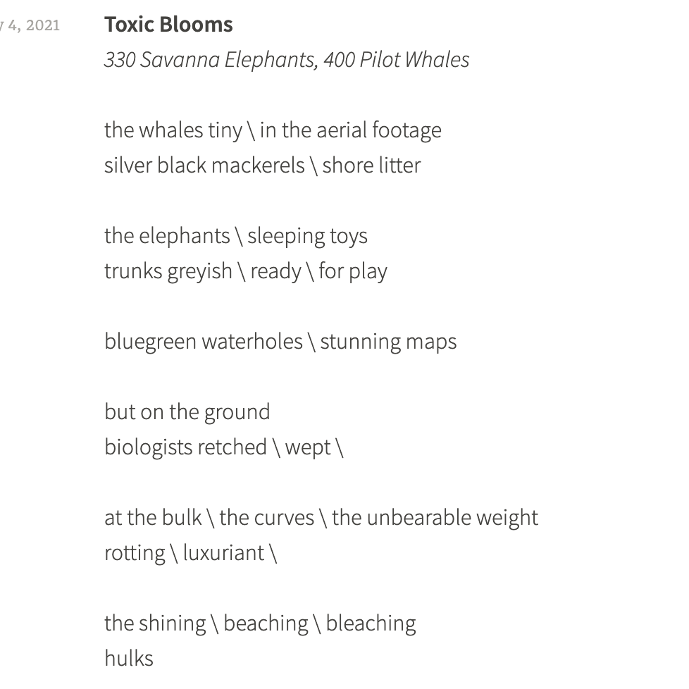 I wrote Toxic Blooms in response to two news articles – 400 pilot whales being beached off the coast of Tasmania, and 330 elephants dying in Botswana, having being poisoned by toxic blue-green algae in their watering-hole. It was as if I needed to be presented with the enormity and bulk of something huge in order to feel that I had anything worth writing at all.