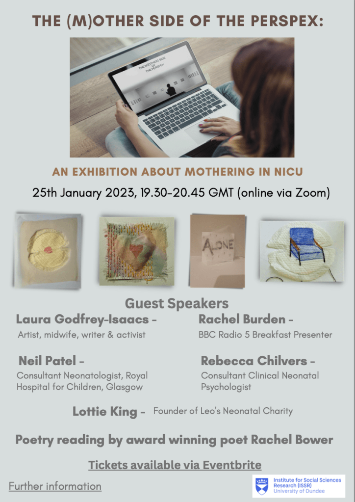 The exhibit includes collage, poems, videos and soundscapes. I’ll be reading one of the group poems and there’s a brilliant line up of speakers, including Rachel Burden (BBC Radio 5 Breakfast Presenter), Lottie King (Founder of Leo’s Neonatal Charity), Laura Godfrey-Isaacs (Artist, midwife, writer & activist), Neil Patel (Consultant Neonatologist, Royal Hospital for Children, Glasgow) and Rebecca Chilvers (Consultant Clinical Neonatal Psychologist).