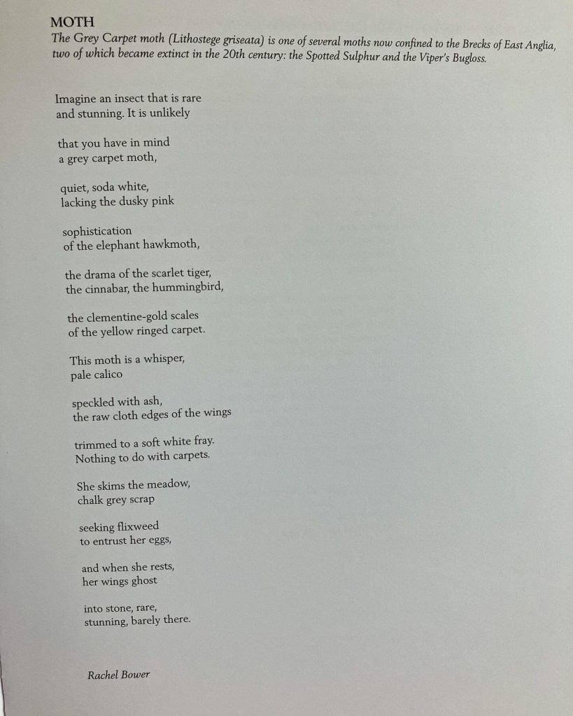 I’m super pleased that another of my endangered insect poems has found a home and hope this brings more attention to the strange and spectacular world of invertebrates! The grey carpet moth is one of several moths confined to the Brecks of East Anglia, two of which became extinct in the twentieth century.